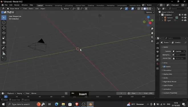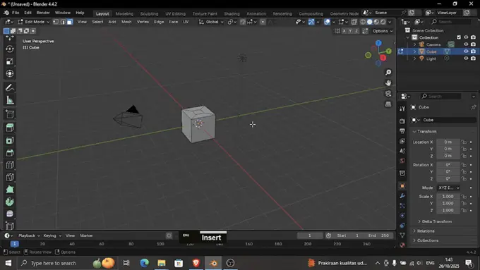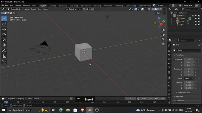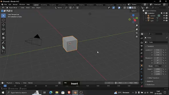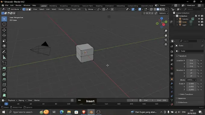 Kita mulai dengan project baru, di sini kita akan melihat ada 3 objek di dalam viewport. cube, light, dan kamera.